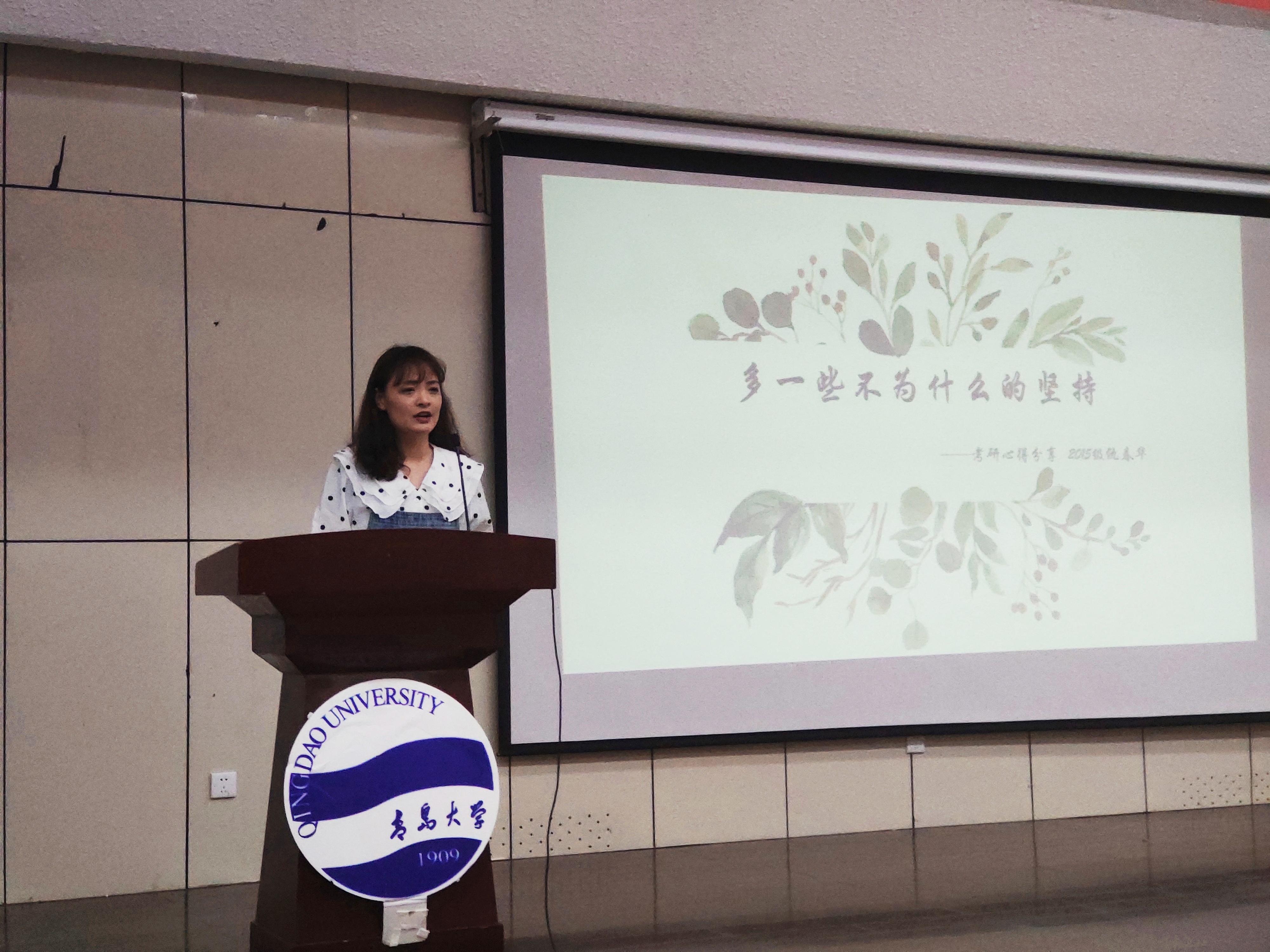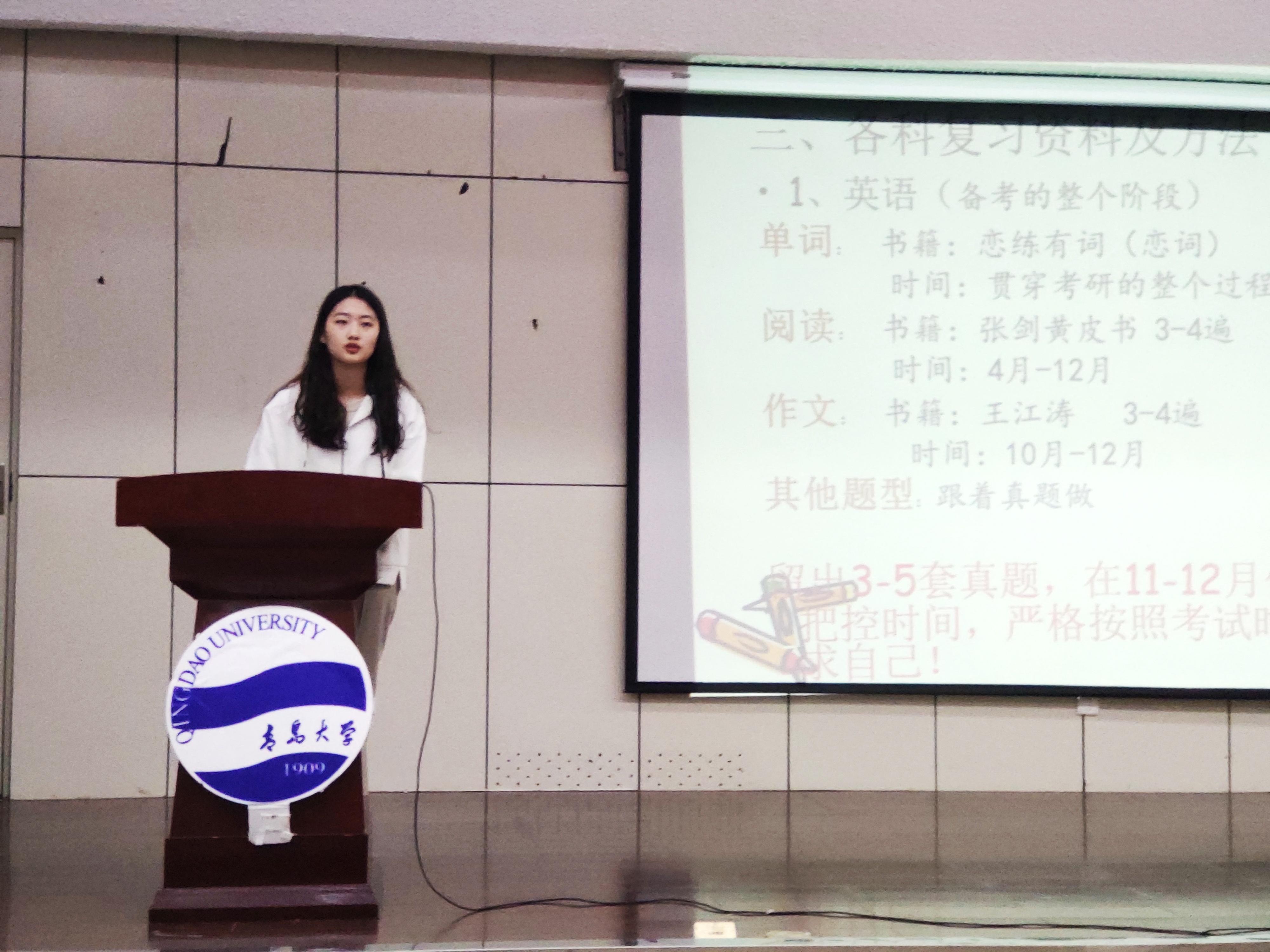 的曲奕诺围绕“脚踏实地,专注于向”进行分享,她从目标、计划、方法和坚持四个方面谈起。目标要理性准确;计划要分阶段,月、周、天、时都要统筹谋划,更要严格执行;方法上不要盲从,要适合自己;坚持上要尽早开始,要坚持到底。同时结合自身考研经历对报考学校选择、跨专业择校等问题进行分享。