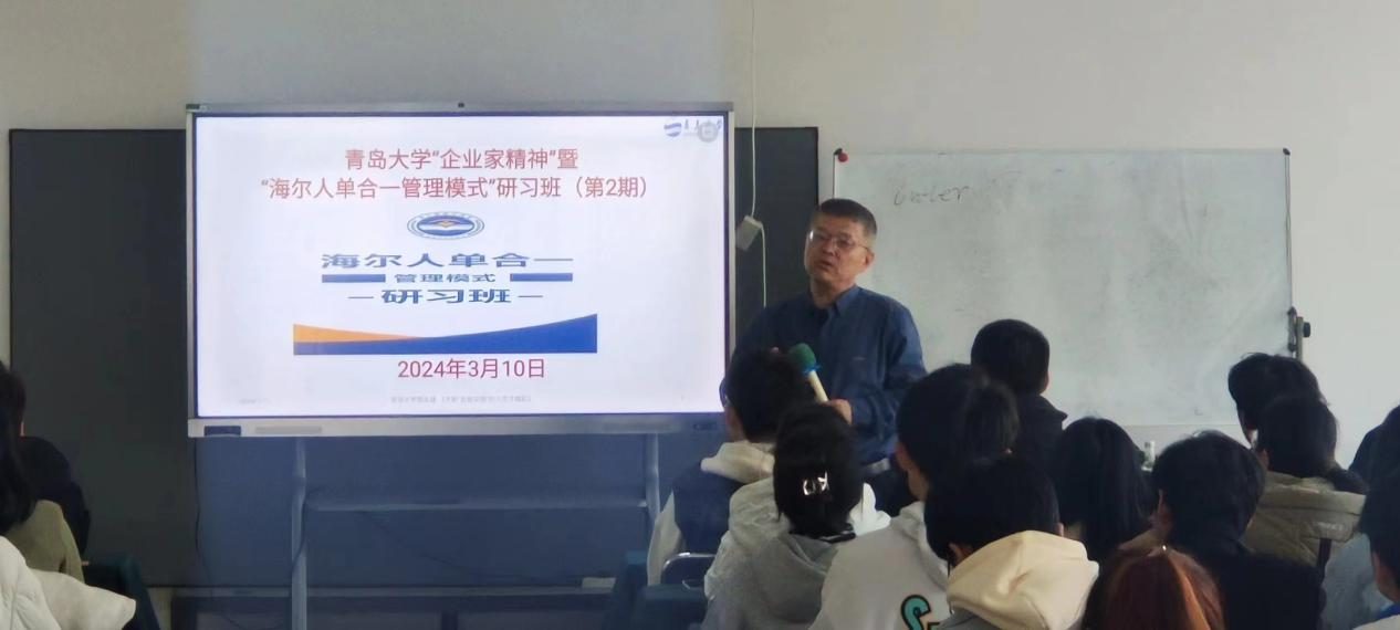 企业家精神是“中国共产党人精神谱系”之一,要求在爱国、创新、诚信、社会责任和国际视野等方面不断提升自己,努力成为新时代构建新发展格局、建设现代化经济体系、推动高质量发展的生力军。“企业家精神暨海尔‘人单合一’管理模式研习班”是青大思政大课堂为响应二十大号召,进一步贯彻习近平总书记关于“大思政课”指示精神,利用社会大课堂和师资体系,以海尔“人单合一”作为研究学习对象的主题研习班,将企业战略与企业智慧融入到学生学习实践中,促进学生学习与创新,并能在提高思想水平的基础上促进素质综合发展。