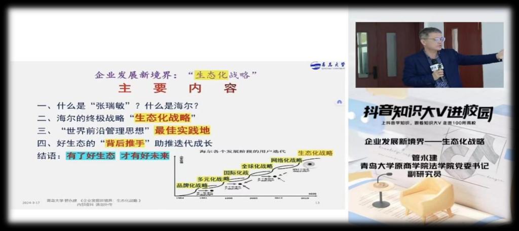 研发楼A座705展开,参与课程的有主讲人管永建老师、研习班的同学及直播间来自五湖四海的朋友,我们还非常有幸邀请到海尔大学原副校长胡春梅老师作为主持人。课程采取抖音直播线下互动的新颖上课方式。“抖音知识大V进校园”是由抖音平台发起的知识分享活动,它邀请来自不同领域的知名人士如作家、艺术家、科学家等,进入高校与学生们面对面交流,分享他们的专业知识和人生经验,本次活动管老师为我们讲解海尔生态战略的知识。