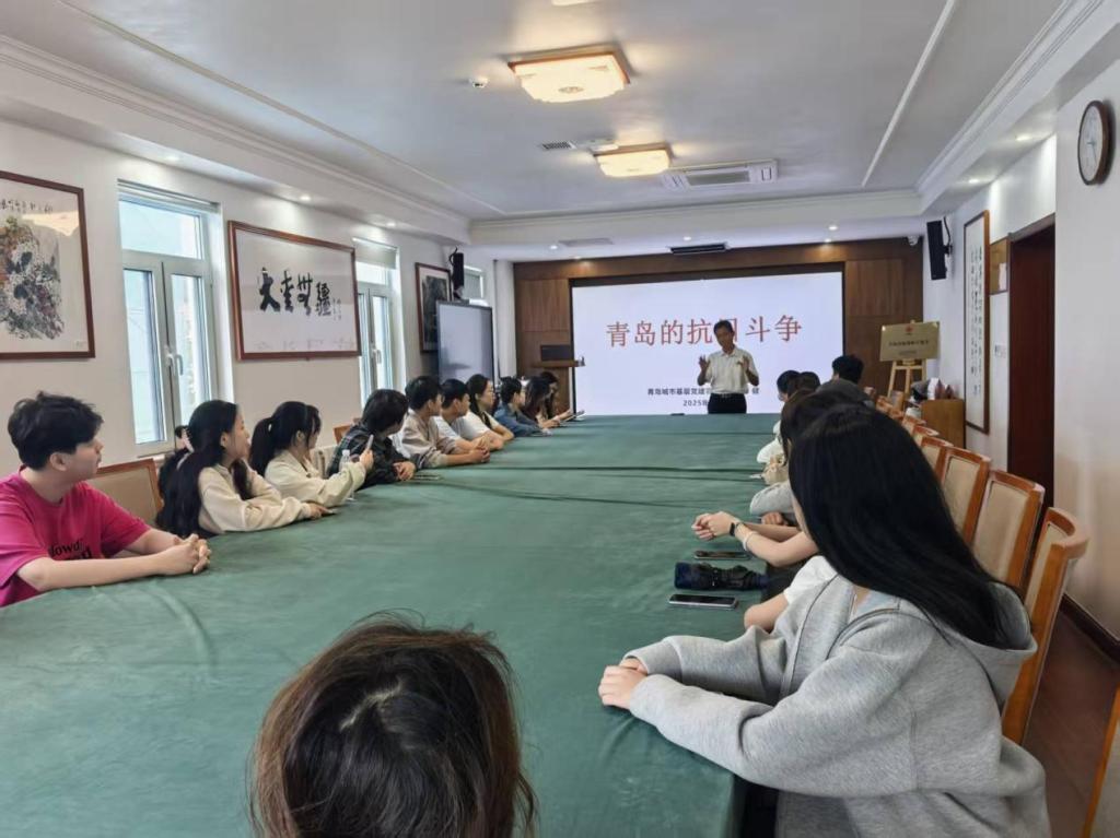 青岛政协文史馆会议室内,杨健老师借助丰富的图文史料,展开了一场生动的历史讲解。他首先追溯了甲午海战的始末,深刻剖析了《马关条约》作为日本侵华重要开端的屈辱历史。随后,讲解转向全民抗战的烽火岁月,通过上海保卫战的悲壮场景与南京大屠杀的铁证史实,揭示了日军的滔天暴行。接着,视线聚焦青岛本土,邓恩铭播撒革命火种、李慰农动员全民抗日、王一民智传关键情报的英雄事迹被娓娓道来。讲解最终定格在青岛抗战胜利受降仪式的庄严一刻,深刻阐明了其彪炳史册的重大意义。