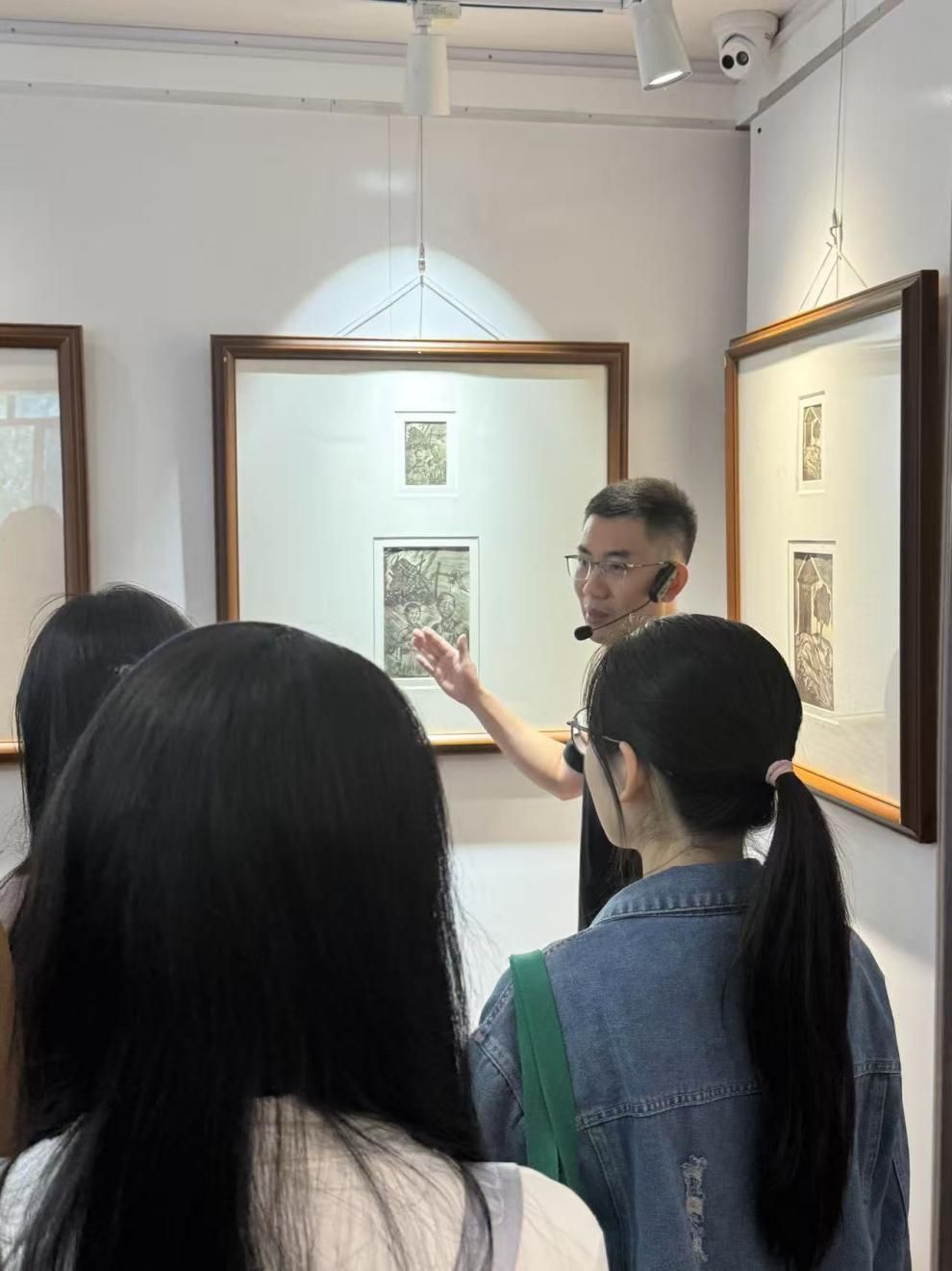 青岛政协文史馆展厅内,解说员王洪江老师凭借专业的文史素养与生动的讲解风格,带领成员们参观“画笔为枪,民族救亡”主题展,展区以版画为载体,通过硬朗的线条与凝练的画面,生动还原了抗日时期中国共产党号召人民万众一心投身民族救亡的壮阔历史图景,那些记录军民协作、群众支援前线的场景,让烽火岁月的抗争记忆愈发鲜活;讲解中,王洪江老师还着重介绍了彦涵、力群、王愚、沃渣四位艺术家的版画作品,细致说明他们如何以刀为笔、以艺传情,将对民族的热爱与抗敌的决心融入创作,让成员们在欣赏艺术的同时,更深刻地感受到抗战时期艺术作品凝聚人心、鼓舞斗志的强大力量。
