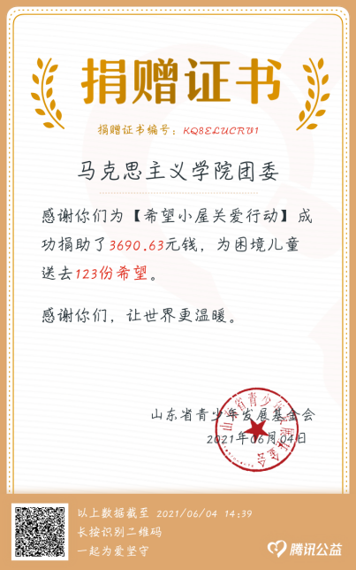 累计参与捐款124人次,为希望小屋关爱活动成功捐款3690.63元,为困境儿童送去123份希望,捐款数额位列学校各学院第二名。小小善款承载的是我们用爱心助力儿童成长的心意,带去的是全体师生满满的祝福与期望。