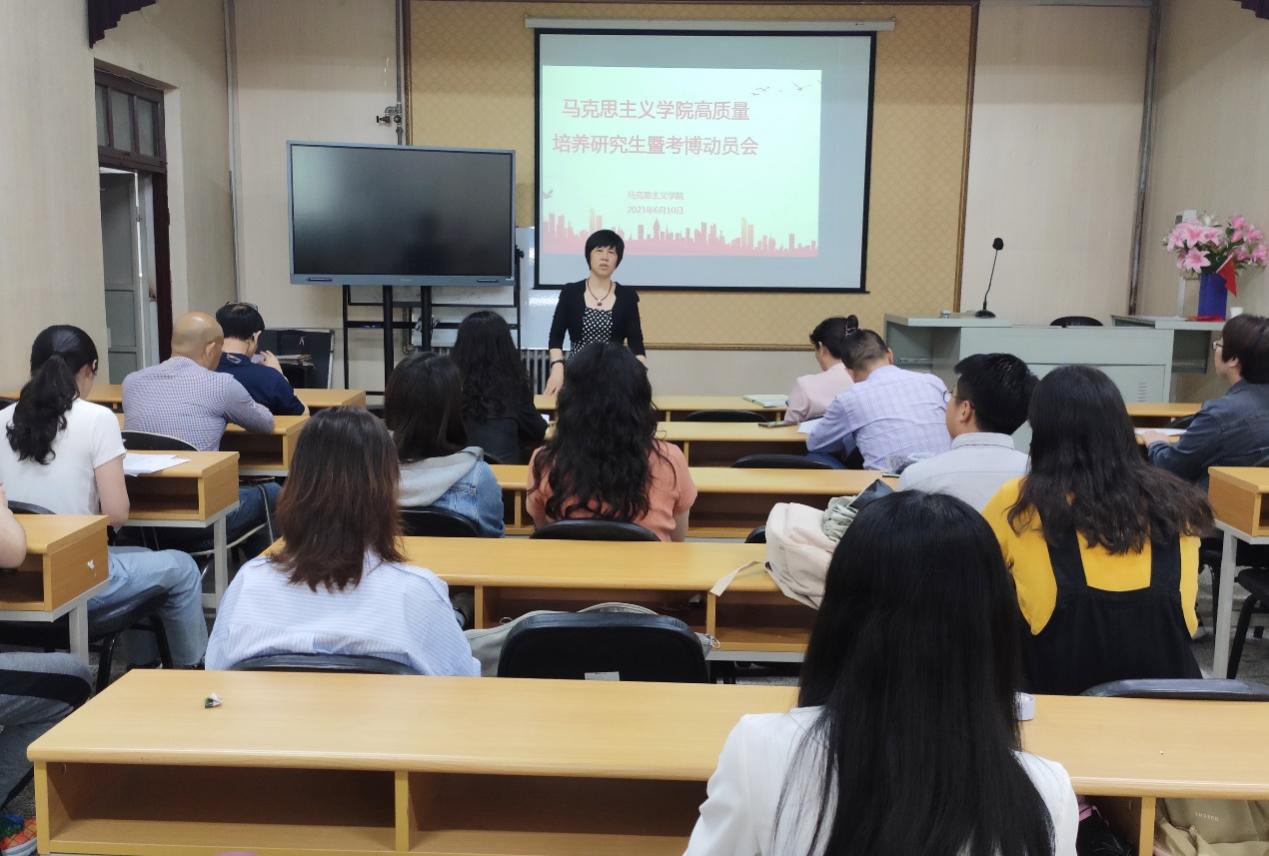 高质量培养研究生暨考博动员会在笃行楼205大会议室顺利召开。会议由研究生教学秘书王翠云主持,副院长郭金鸿、姜文明和学科负责人曲新英、赵永刚、全体硕士生导师及辅导员张妍出席了会议,2019级、2020级全体研究生参会。