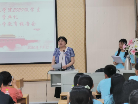 党委书记赵茗、院长尉利工、党委副书记姜淮、副院长郭金鸿、副院长姜文明、教师代表庚建凤、辅导员陶征、张妍及2020级全体新生出席开学典礼。