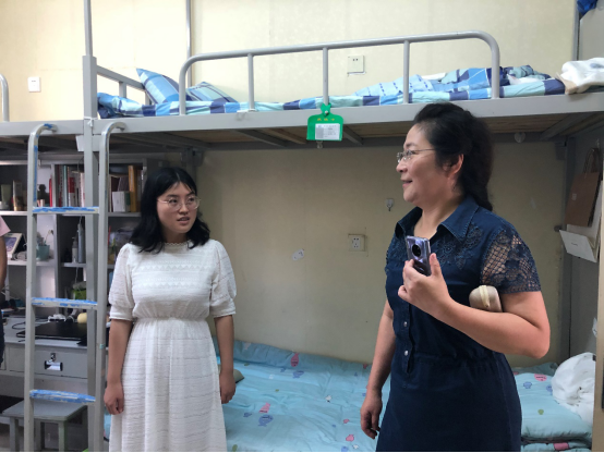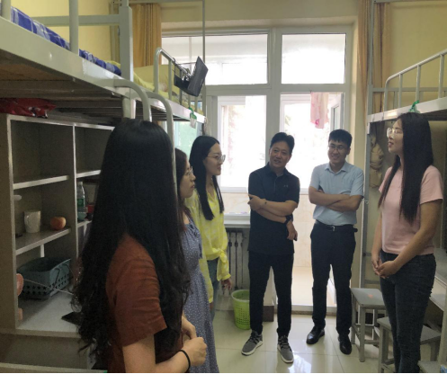 党委书记赵茗书记,副书记姜淮,辅导员陶征,2019级研究生刘亚旎,前往2020级研究生新生宿舍走访慰问。