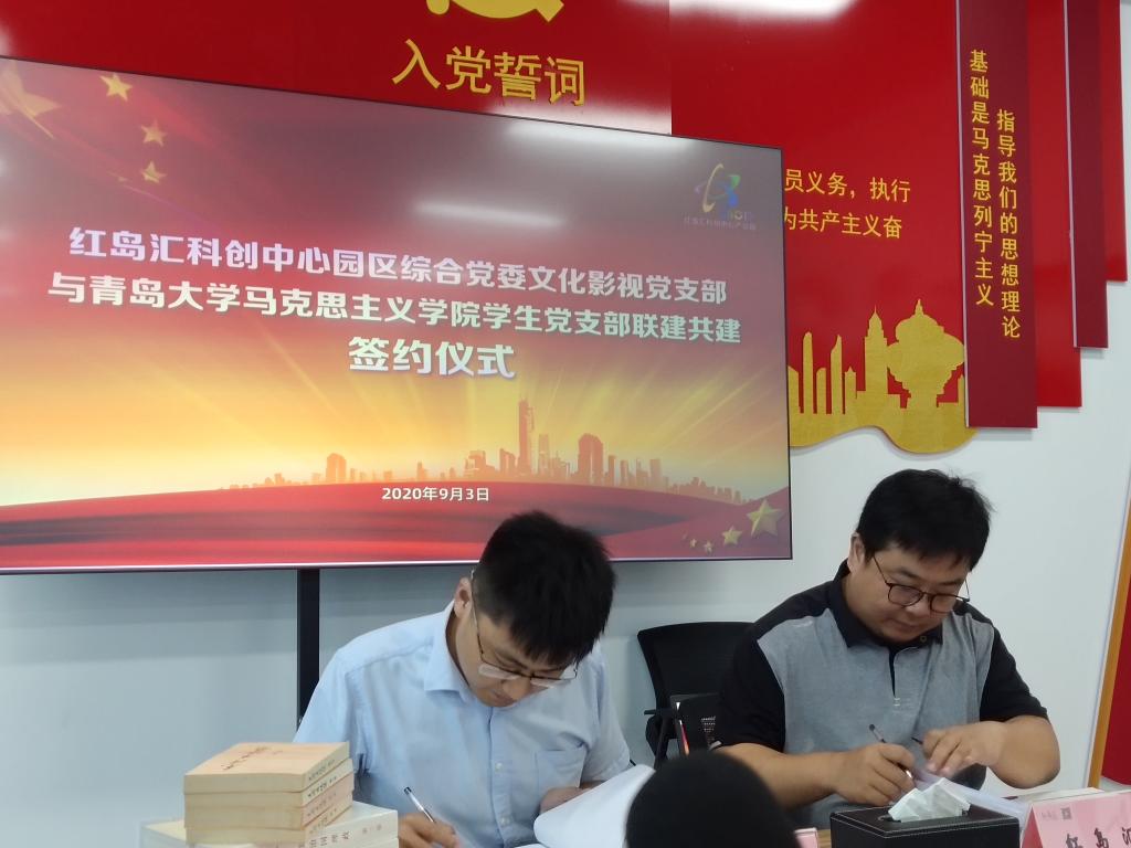 学生党支部书记陶征、教工第一党支部书记庚建凤,红岛街道党工委员陈淑玲,红岛街道党建工作办公室负责人刘玉玲,红岛汇科创中心园区综合党委书记李荣华、副书记高雪,文化影视党支部书记杜兴东出席签约仪式。