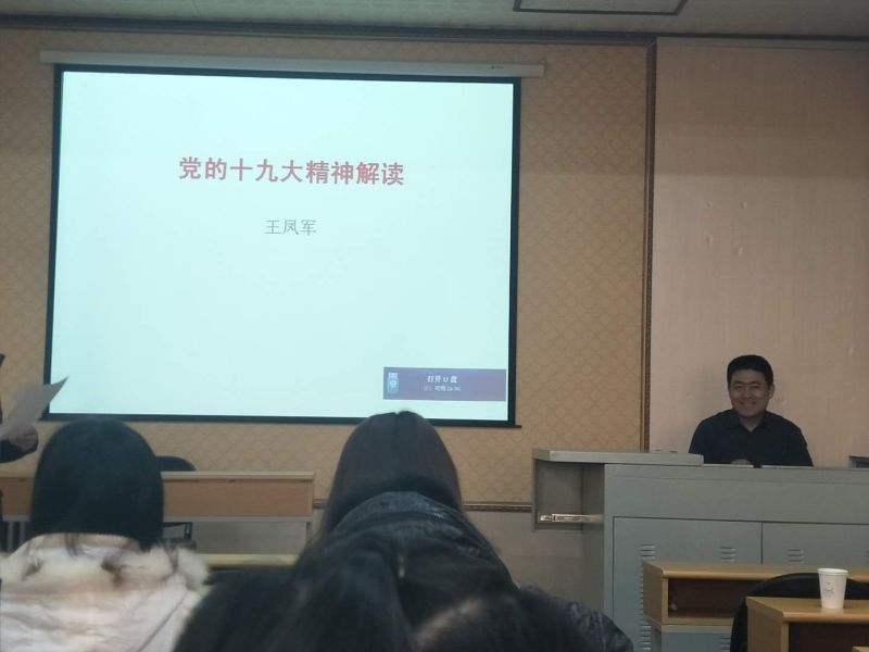 王教授最后还对同学们提出了要求,希望大学生能够深刻认识和把握十九大精神,切实提高学习贯彻的自觉性和坚定性,要有政治意识,责任意识、担当意识,努力学习,提升自身素质和能力,为实现两个一百年奋斗目标贡献自己的一份力量。