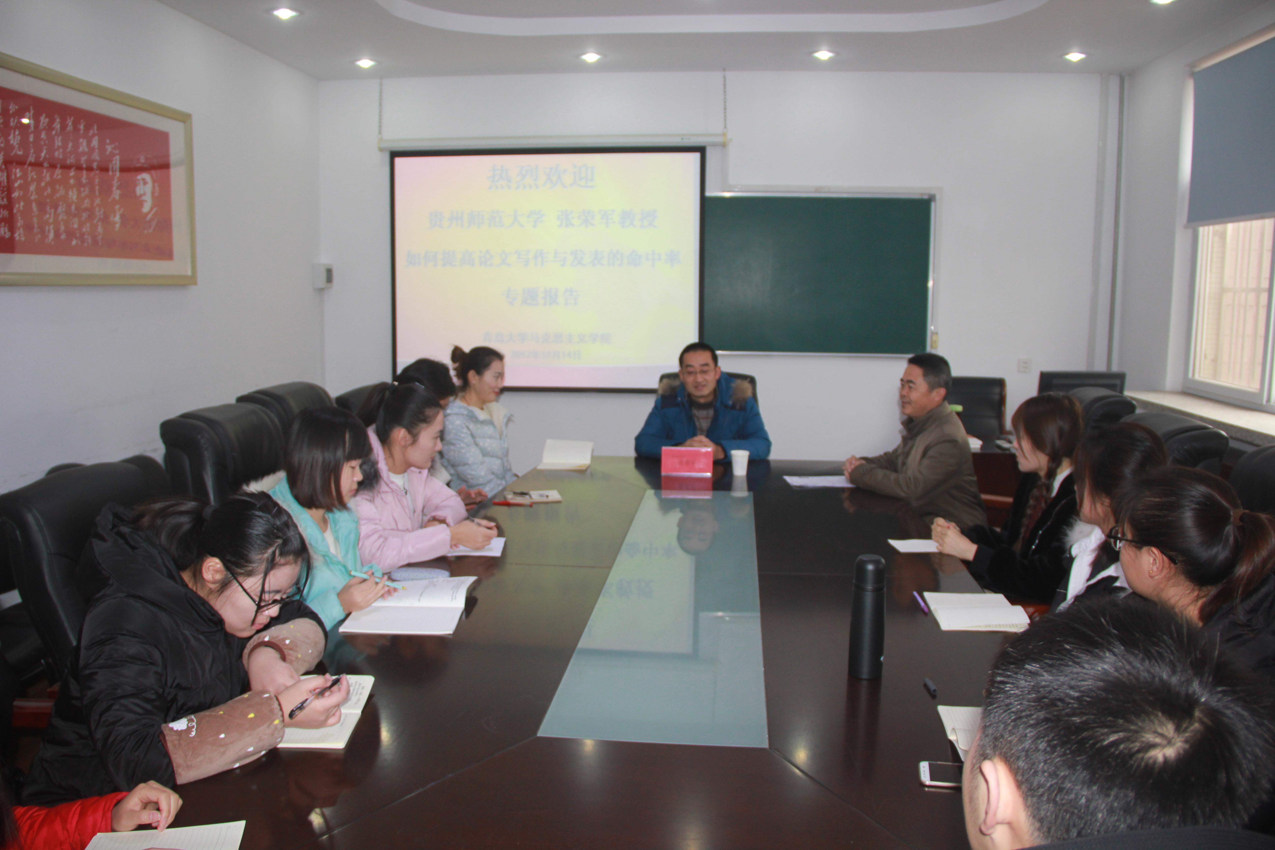 12月14日上午,贵州师范大学张荣军教授来51吃瓜网 作题为“如何提高论文写作和发表命中率”专题讲座。讲座由学院常务副院长丛松日主持,学院2016级、2017级硕士研究生聆听了讲座。
