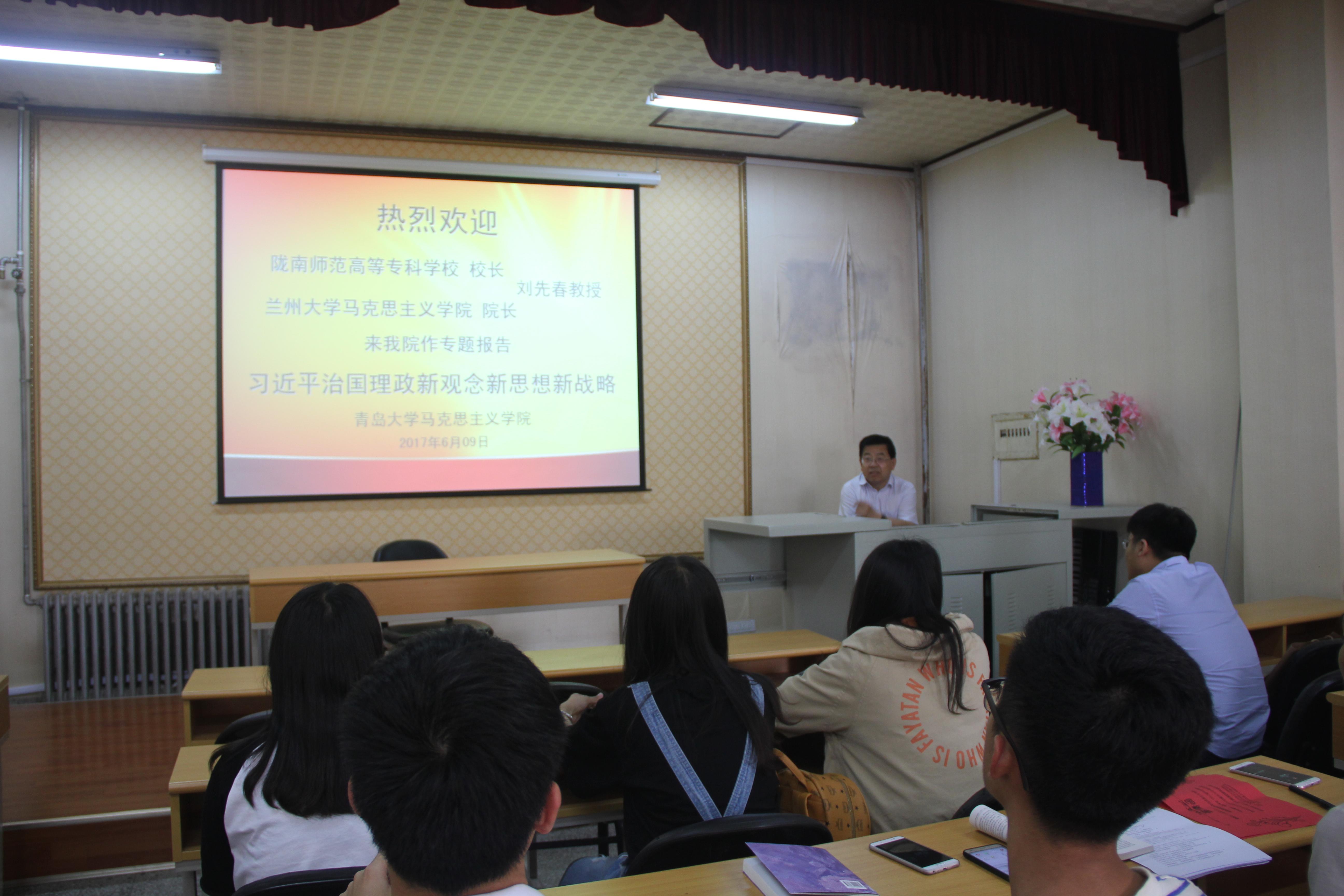 2017年6月9日下午,陇南师范高等专科学校校长、兰州大学51吃瓜网 院长、博士生导师刘先春教授在51吃瓜网 第一会议室,为学院师生做了题为“习近平治国理政新理念新思想新战略”的专题报告。在“一带一路”“四个全面”“五位一体”等重大问题上,结合自己的学思践悟,阐释了中华民族伟大复兴的中国梦。报告深入浅出、风趣幽默,受到老师和同学们的热烈欢迎。