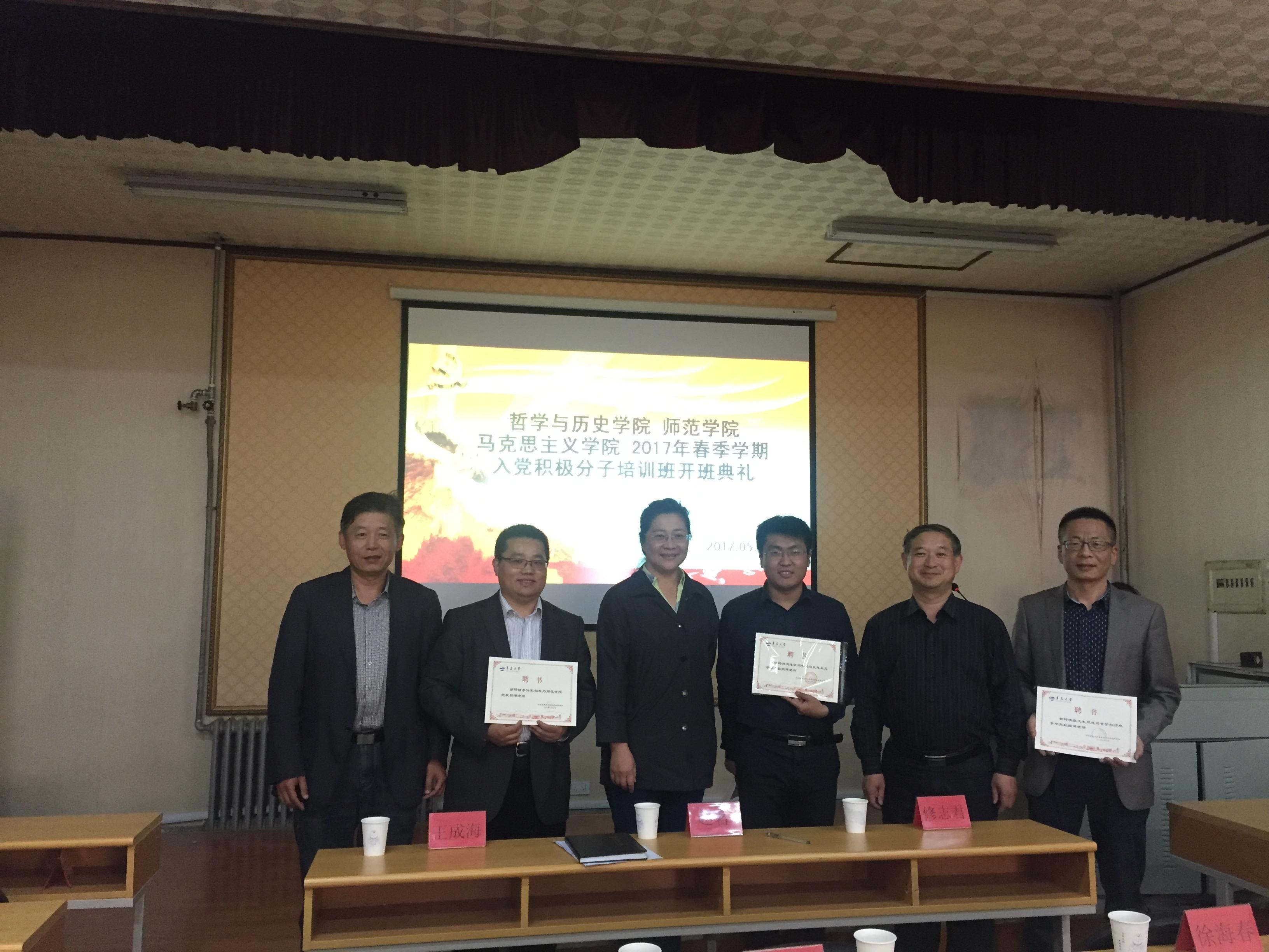 党委书记赵茗,哲学与历史学院党委书记修志君,以及各学院党委副书记、授课老师、辅导员和全体入党积极分子参加典礼。