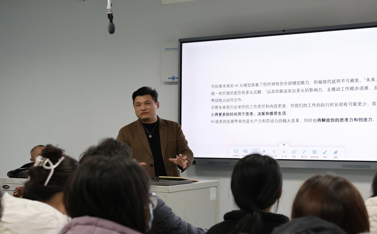 接着,嘉博智合品牌设计有限公司总经理、研习班指导老师步宪垒老师向大家指出当今时代下应接受并学习AI,为我们今后的发展而服务。他提到,AI时代的到来会加速相似岗位的融合,产生新的复合式岗位。有了AI技术的加持,我们可以承担和创造的内容远远超乎想象。他提出Al技术的发展带来的是生产力和劳动力的极大变革,同时也将解放自身的思考力和创造力,同学们应需要具备主动性,借助AI的帮助打破边界,向前多走一步,将来可以将更多的时间用于思考、决策和感受生活。