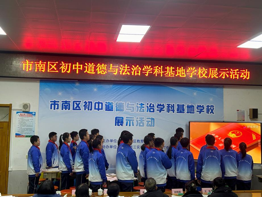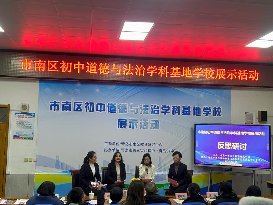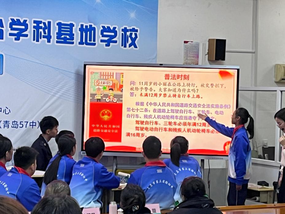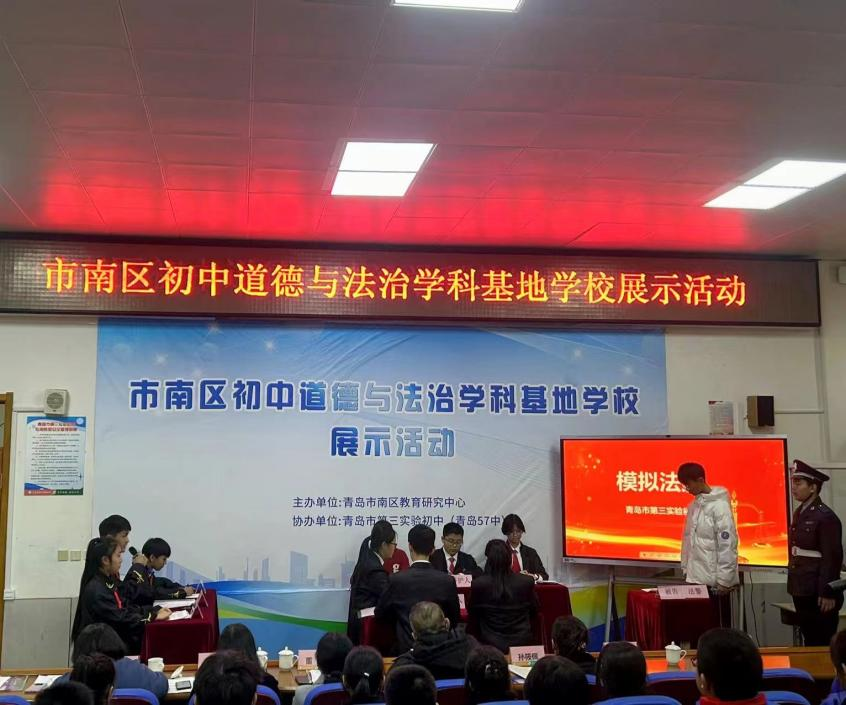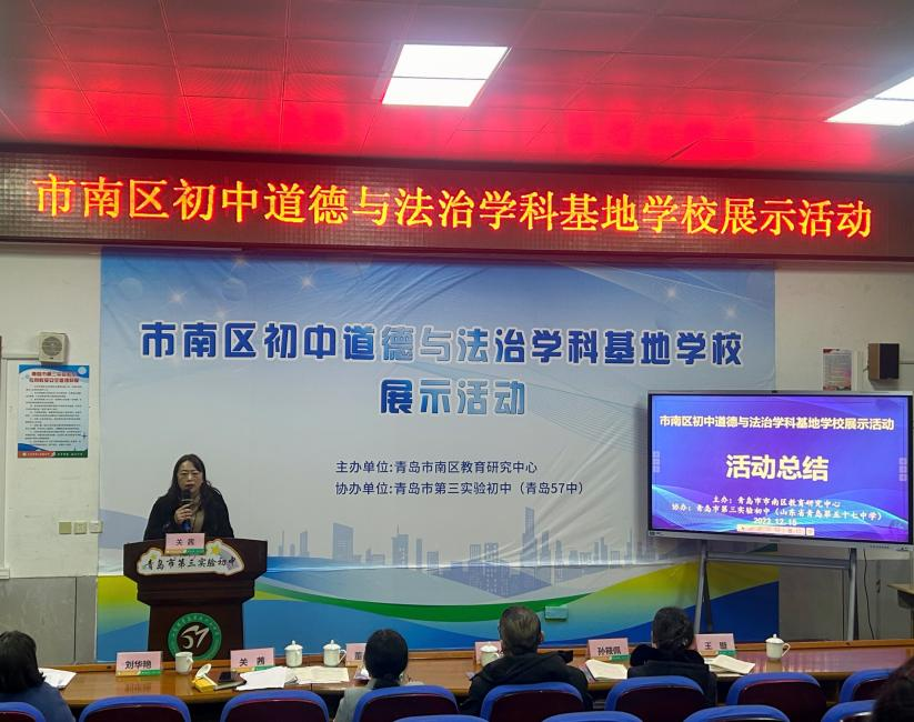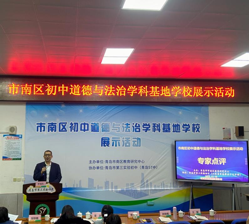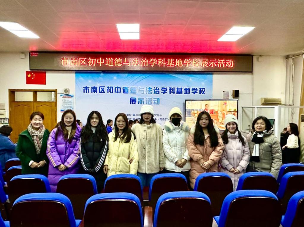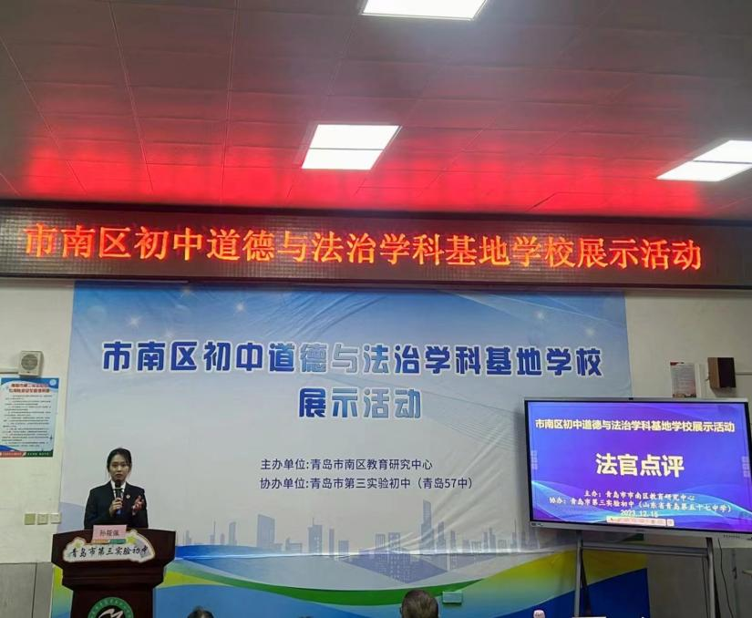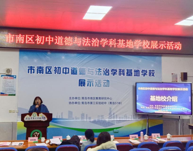 法学院李瑞生教授、云南路人民法院法官孙筱佩、市南区教育研究中心教研室主任关茜、市南区初中道德与法治教研员刘华艳、青岛57中校长董涛和市南区全体道德与法治教师参与展示活动。