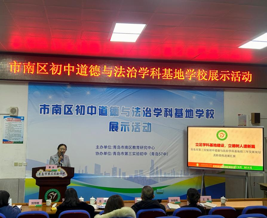 教研员刘华艳老师介绍了市南区初中道德与法治学科基地建设的意义及学科基地学校基本情况。57中校长董涛以“立足学科基地建设,立德树人谱新篇”为题,介绍办学理念和教育教学新发展,她围绕调整学科团队,明确职责;建立健全制度,做好保障;认真扎实开展活动;预期成果四个方面进行《解读道德与法治学科基地校三年发展规划及阶段性发展》汇报。