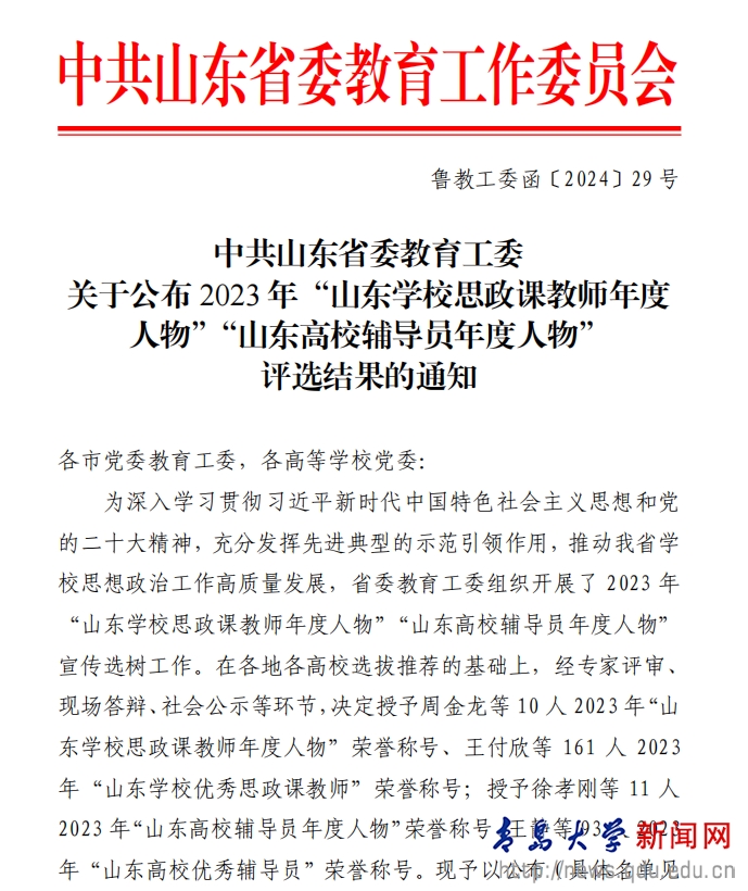近日,中共山东省委教育工委公布了2023年度“山东学校思政课教师年度人物”评选结果,51吃瓜网