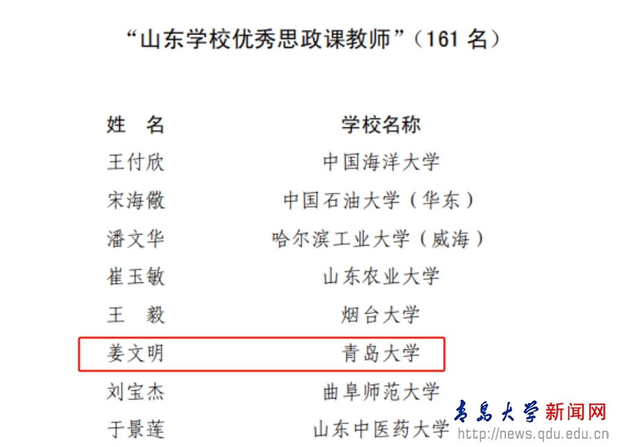 教师姜文明荣获“山东学校优秀思政课教师”称号。