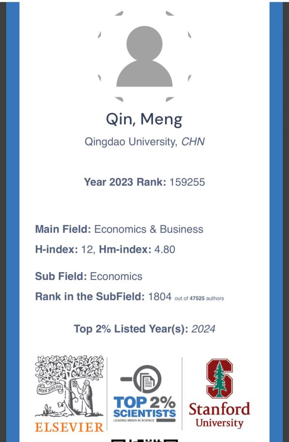 秦梦副教授入选榜单,并位列全球经济学子学科排名1804位(总47525人),实现学院在国际学术领域新的突破。