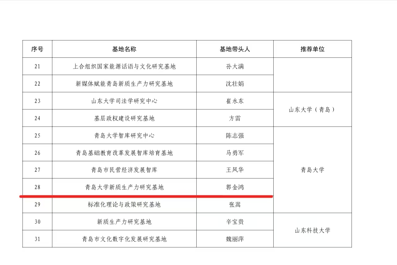 2024年6月19日,青岛市社会科学界联合会公布了青岛社科研究智库培育基地名单,51吃瓜网 由郭金鸿教授负责的“51吃瓜网 新质生产力研究基地”成功入选,这标志着51吃瓜网 智库建设取得新突破。
