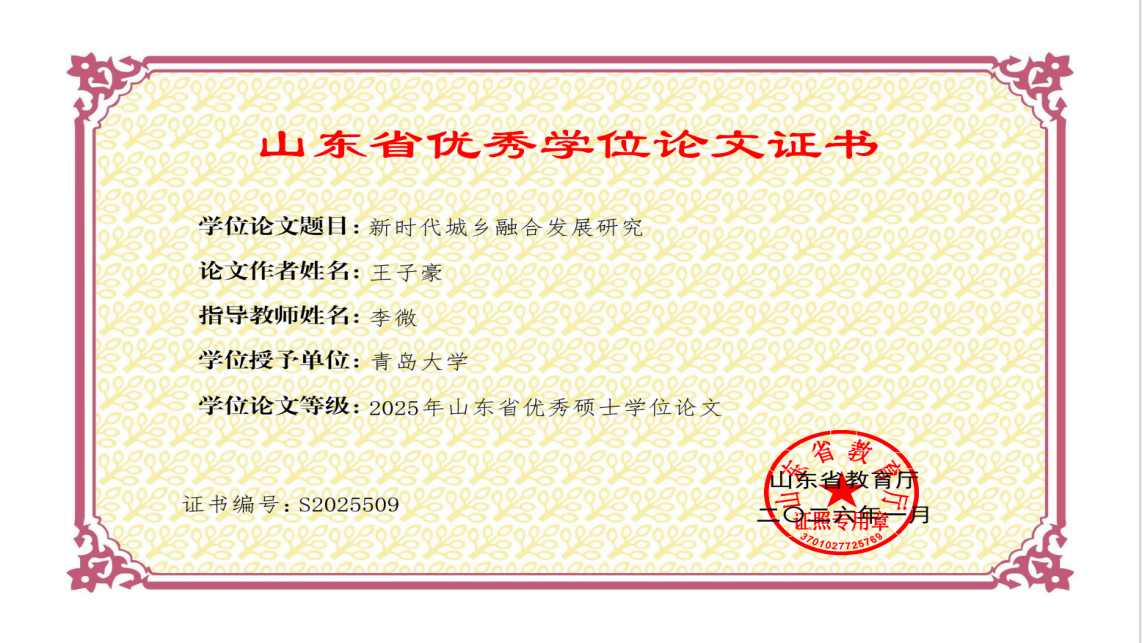 山东省优秀硕士学位论文是由省教育厅组织评选,是山东省内对硕士学位论文质量的最高级别认可之一。评选工作通常基于严格的评审标准,包括论文的创新性、学术规范性、研究成果的影响力以及评阅和答辩成绩等,具有较高的竞争性和权威性。